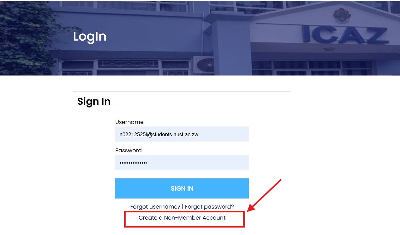 - Go to the Registration Page: Navigate to the ICAZ login page and click on "Create a Non-Member Account" or a similar register link.